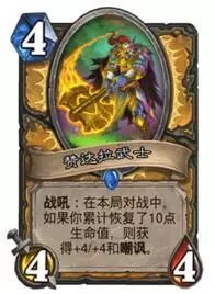 4费4/4战吼本回合累积回复10血则获得4/4和嘲讽,在奶牌有了真正回复效果后,就能更早实现累积回复10血了,而不需要做主动卖血这种蠢事,越早触发武士的效果,便能越早入场抢节奏,即便8费入场个人以为也是很强的,还有4费可以掏大宝剑解场或者下其他随从,水晶利用率极高。