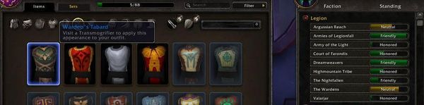 如上图中的例子,这个在守望者阵营中只有中立(Neutral)声望的110级角色,他的藏品中的守望者战袍已经解锁,可以进行幻化了,而且幻化没有任何声望的要求。