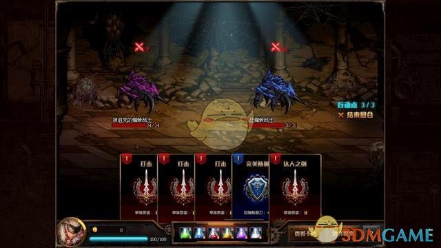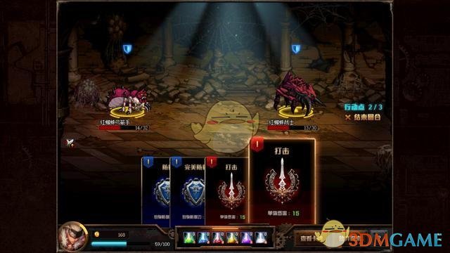 我们点击一个牛头怪物图标会进入战斗界面,战斗没有时间限制,有行动点,我们点击一张卡牌,然后点击怪物就能造成伤害