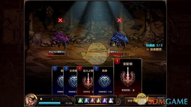 我们点击一个牛头怪物图标会进入战斗界面,战斗没有时间限制,有行动点,我们点击一张卡牌,然后点击怪物就能造成伤害