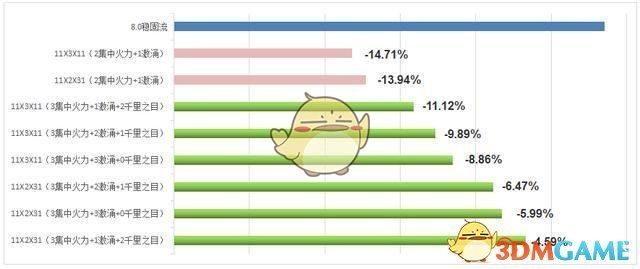 我以8.0稳固流为对照样本,比对了几种天赋与特质组合,线段后的百分比即为相比与8.0稳固流,下降或增加的百分比