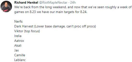 8.23版本已经在国服正式上线了,昨日,拳头平衡团队的设计师发推特列举了他们将在下一个版本中对哪些英雄和天赋进行调整。