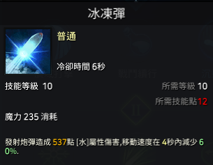 2,冰冻弹,CD6s,伤害并不高,但是却有超强的控制能力,个人觉得是PVP强技,在pve中也可对boss进行防御力的降低。