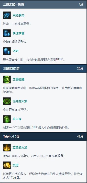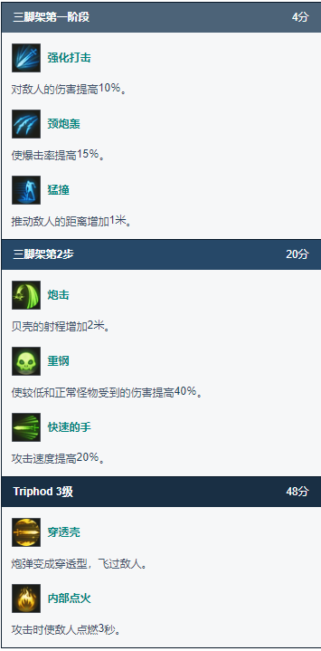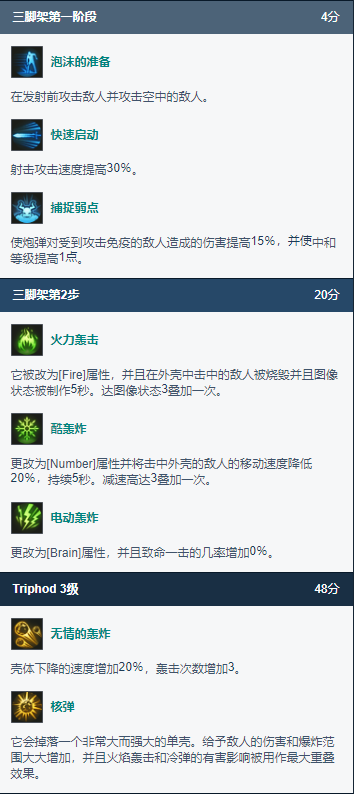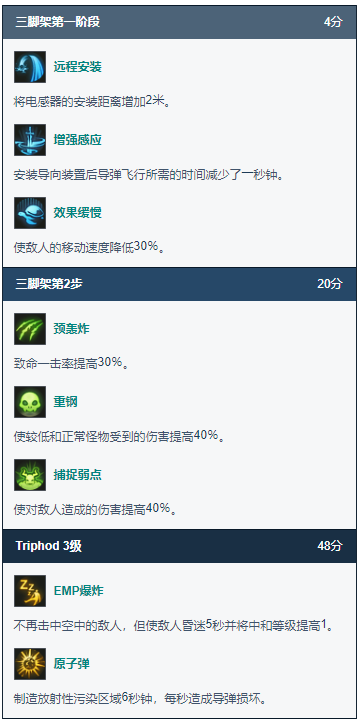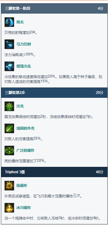 三脚架第一层增加射程,减少消耗和加强效果,前两个不说明了,主要说明下加强效果,对敌人移动效果减少20%和对种子级别以上敌人增加伤害,这估计是这个技能在pve上的唯一亮点,也就是说虽然boss免疫冰冻效果,但是也会受到增伤的效果,非常漂亮,如果你想带上这个技能,毕竟冷却时间是6s