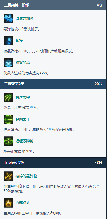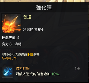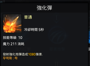 强化弹。5秒CD,满级伤害尚可,经过测试搭配三脚架,这个技能应该是必选的,三脚架中