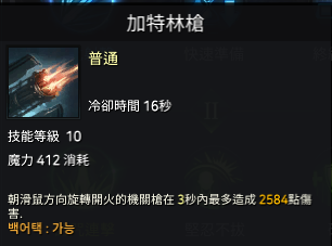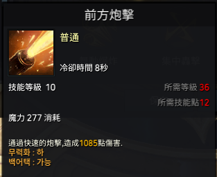 我嘛,因为是韩服,实在没那个耐心往下推进度,所以我去练各种职业去了,上次给大家带来了拳霸的加点方案,这次给大家带来的是枪炮大师,下面简称大炮,这次写的可能会比上次拳霸的更详细点,所以拳霸朋友们不要怪我,上次太急了,下面开始。(PS加点推荐是以50级,大部分人的情况是拥有264点技能点,可以点满5个全满技能,加上1个7级技能的情况分析,考虑篇幅,打字太累,部分会有点简单,不过