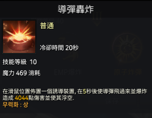 这个技能和炮塔有异曲同工之妙,但是要看好摆放位置,不然怪跑了就打空了,考虑到打boss的时候使用,一层点出增强感应加快速度,二层点捕捉弱点针对boss,三层核弹,伤害就够了