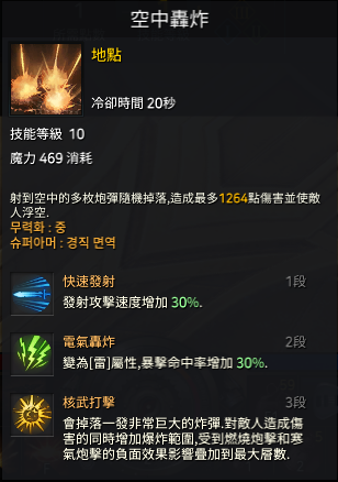 5,轰炸,高爆发高范围,fb清兵,就算打boss也不怯场,第一层你可以选择快速启动或者捕捉弱点,捕捉弱点是针对boss级别的怪,加快释放速度能让你更灵活起来,第二层选择电属性增加暴击,第三层放核弹,经过测试,核弹效果更好。