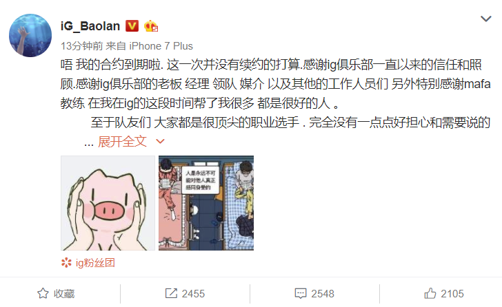 iG战队辅助宝蓝突然在微博发布消息,表示自己合约到期将会离开iG,重新寻求队伍并再次进入S9世界赛。