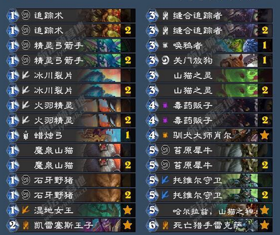 如带大量低费随从,二王子的价值会比较高。不过任务猎的常见问题是,大量一费导致前期的卡组质量不行,空过亏节奏。山猫之神保守期望能拿五到七张小山猫,下回合再出女王,解决问题。如果怕快攻,甚至能加入一些节奏卡如放狗或侧翼打击等。