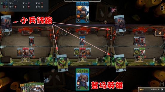 同时会派出两名小兵随机刷新在兵线上。小兵所在的线路是双方已知的,而英雄的线路则是未知的。