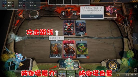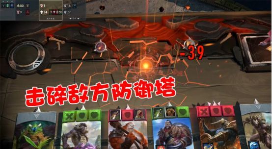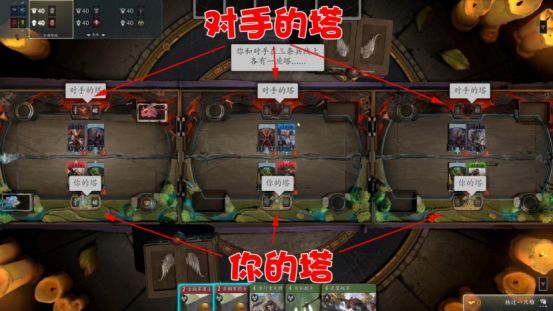 每条兵线都有一座40点血的防御塔,而游戏胜利的目标,则是率先推掉敌方两座塔,或者直接推掉敌方基地。