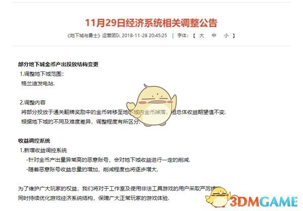 官方在11月29日发布了一条公告:表示将限制格蓝迪副本地图的金币收益,主要限制方法为:将地图内的金币收益增加,减少通关副本的翻牌收益,并且根据难度不同,收益的多少也会有差距。最最最重要的是将严厉打击账号金币产出异常的账号,将该账号的收益逐渐缩减。