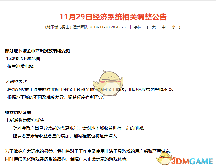 DNF最近更新策划对游戏经济系统做了相关的调整,可以说这一调整让最近的金币了是小副本下降,搬砖党和工作室等都基本上遭到打击,格兰迪砖厂真的已经面临倒闭状态了。