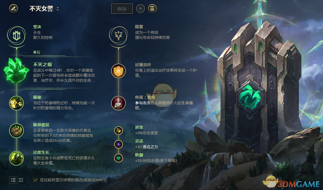 符文方面,主系坚决系,使用不灭之握、爆破、骸骨镀层、过度生长,不灭之握自然不用多说,配合爆头伤害也非常可观,爆破符文则是不灭女警的核心,利用爆破去进行快速推进,骸骨镀层则是对拼的关键,过度生长可以考虑换成复苏,提升回血的效率。