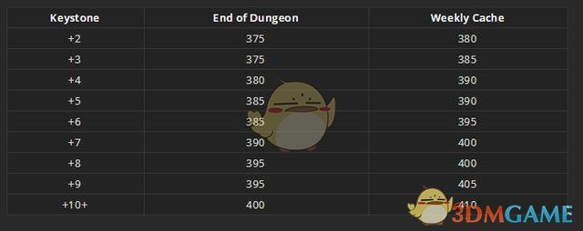 此图为第二赛季的m+的副本掉落装等和周箱子结算装等:如图,第二赛季:10+大米掉落装等为400.10+大米周箱子可以开出410装等装备(团本为415)