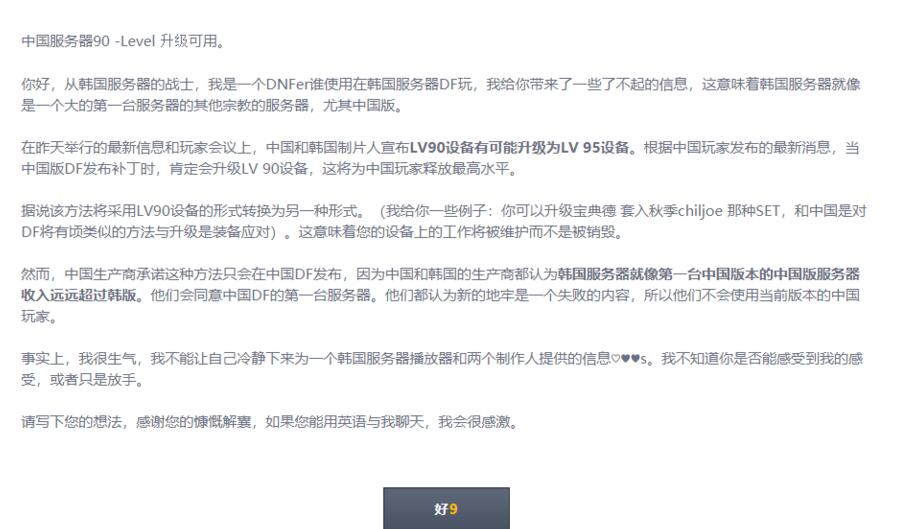 作为国服DNF玩家小游君觉得韩服能否升级95B其实意义并不是特别大,至少是与国服无法相比的,成本都远不在一个档次上,而且国服玩家的数量远超韩服,氪金能力也是无法相提并论的。不过从韩服玩家角度来看,中韩区别对待确实有失公正,也确实会令韩服玩家不爽,但没办法谁叫国服才是爸爸呢?