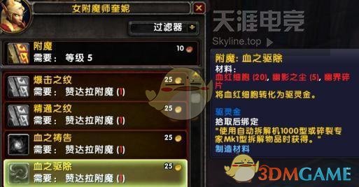 附魔,很重要的新技能,血之驱除,可以血红细胞转驱灵金!!只需要1等级就可以,到时候缺驱灵金的可以洗一下附魔。