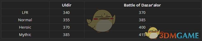 如图:新团本达萨罗之战,装等掉落分别是:370(随机)-385(普通)-400(英雄)-415(史诗)