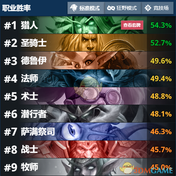 从新版本第四日各职业胜率统计来看,猎人依旧以较大的优势位居第一,而昨日排名第四的德鲁伊却以微弱的优势反超了法师来到了第三的位置。其他各职业虽然在胜率上有所变化,但具体的排名却没有浮动。但由于是版本初期,此排名仅供参考。