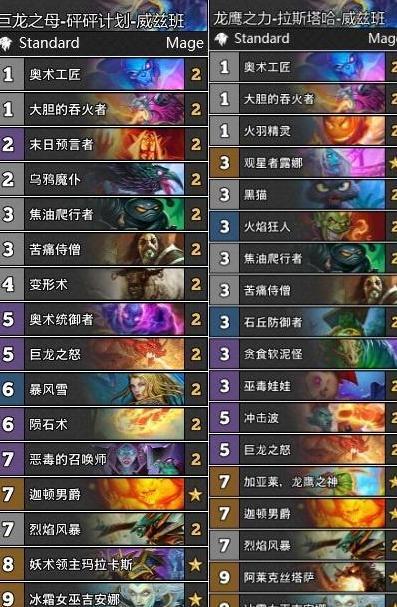 法师的威兹班卡组是巨龙之母与龙鹰之力。巨龙之母就是带奥术统御者的龙妈法,意外是带了恶毒的召唤师。这套卡组加入了新橙卡妖术领主马拉卡斯,战吼可以补手牌,就是复制你起手的卡牌置入手牌。龙鹰之力则是带了龙鹰之神的奇数法,起手英雄技能2点伤害,很容易打出8点伤害来。龙鹰之神就可以用战吼召唤出大螺丝了。