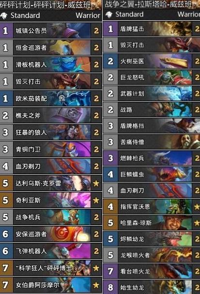 9.战士:砰砰计划就是机械战,变动不大。战争之翼走的是巨龙路线,但是没带砰砰飞艇,感觉强度也不是很高。前期解场不错,中期依靠龙牌质量碾压对手,如果对手挺过去了就没戏了。因为这套没有爆发式的铺场,所以打慢速卡组很难有出奇制胜的机会。