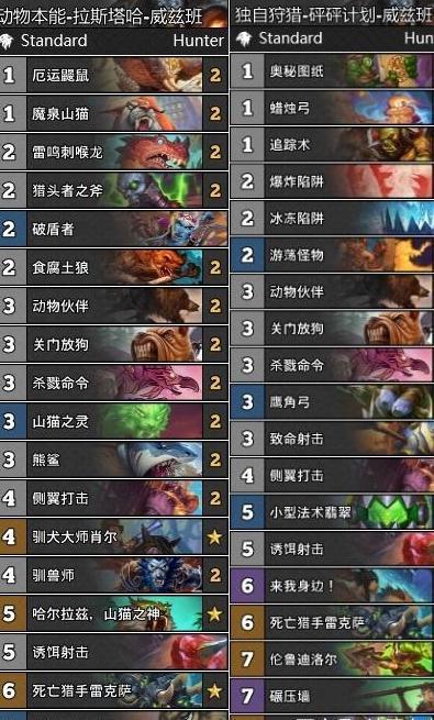 7.猎人:动物本能是一套快攻型卡组,比纯快攻慢一点,比中速卡组快一点。这套卡组带了山猫系列强化了解场,带了DK可以打后期。值得一提的是除了关门放狗BUFF食腐土狼,送山猫也可以BUFF食腐土狼,猎人的斩杀很难防。所以食腐土狼自带嘲讽,必解。独自狩猎就是当前版本的法术猎塞了张祖尔金,这就等于塞进去一个梦想,一卡翻盘。