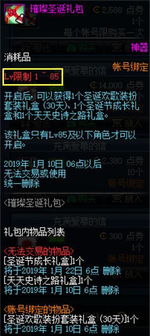 圣诞节成长礼盒开启限制为70级,并且礼盒内有16张升级券,也就是大家可以从70级直接升到86级,对于号里有小号需要升级的玩家来说还是不错的,并且还有5个5倍的经验胶囊,轻松升满90级,不过因为史诗之路要求极低,所以毕业票肯定是刷史诗之路,因此100个大眼仔如果有期限就根本没有用了,除了这些还有辅助装备、魔法石和耳环任务完成券,这3个特殊装备完成券能省下一些金币。但是不足以抵消25块钱。