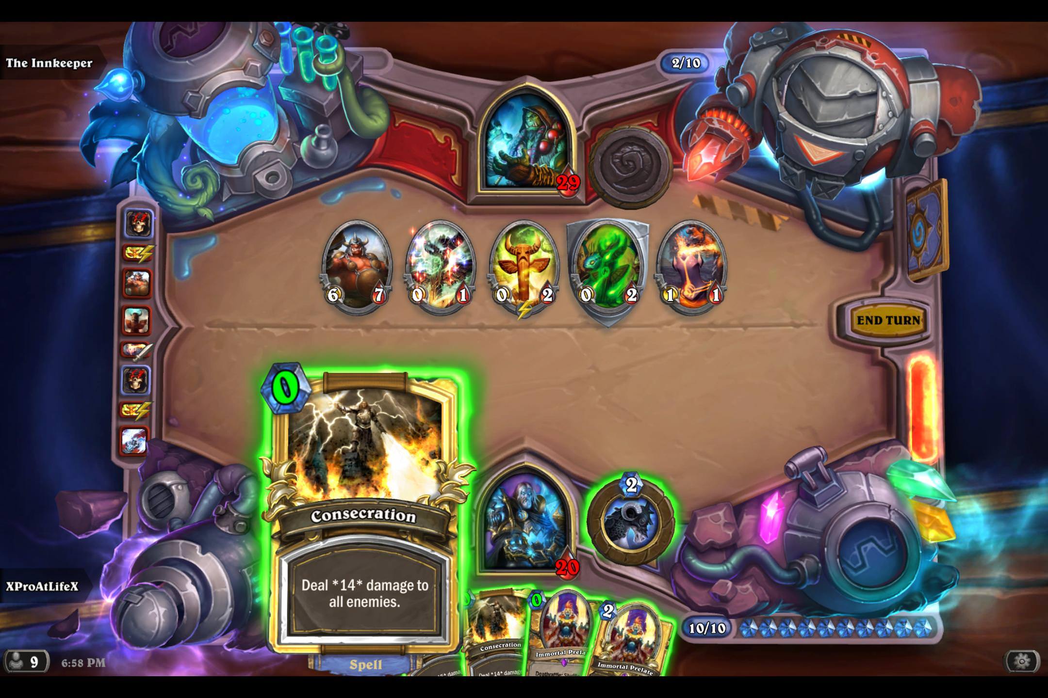 在截图中可以看出来,永恒祭司在获得法强的buff后,洗入牌库又被抽到手中后,在场上没有任何其他法强随从的情况下,本来打2的奉献法术,竟然有+12的法强buff,变成打14伤。根据这名玩家所述,在手中的永恒祭司的法强buff加起来正好是12点。说明就是手上的永恒祭司提供了这种buff,这是第一个游戏BUG。