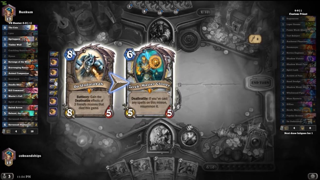 新版本的送葬者安德提卡是获得本局已死亡的随从的3个亡语效果。但是,在牧师的克隆大师泽里克死亡后,送葬者安德提卡获得了了其亡语效果,而触发亡语效果后,获得的本来应该是送葬者安德提卡本体,但是在这位玩家的测试下,送葬者安德提卡的亡语却是掉出了克隆大师泽里克,也是让人搞不清楚这个“BUG”般的结算机制。