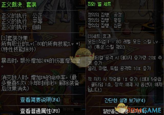 正义裁决这一套属性相当不错,不过套装属性确实不够强,1-80级的技能等级加1,如果能改为全技能等级,那么吃二觉的职业肯定可以作为优先选择,不过就是改版后还是没有达到全技能等级+1,不过改版前24%的追加暴击伤害在改版后降低为20%,但是新增了10%的三攻,也是一个非常不错的加强了。毕竟按全面说的假设属性,原来的追爆提升仅有18.46%,而改版后的综合提升可以达到24.99%。