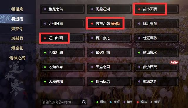比如【如梦令】中的刀剑如梦、千古风流、姑苏绮罗就显得格外显眼,因为大区内剩余的所有服务器都绿了。