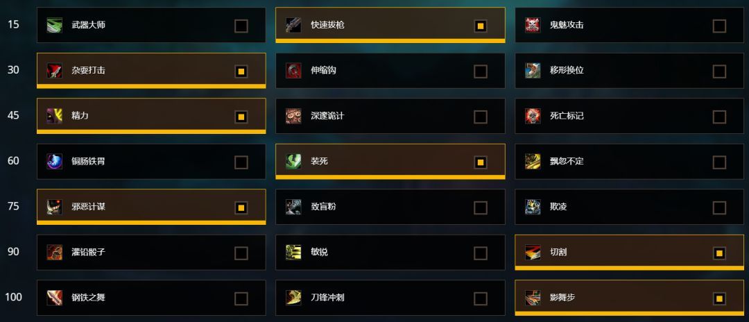 天赋如图所示,最后一层影舞步和冲锋差异并不大,由于本套配置的特色就是简单,所以干脆选择比冲锋更加无脑的影舞步。