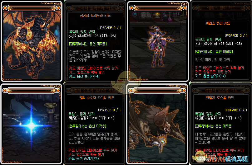 首先是武器的附魔,武器附魔和现阶段毕业附魔是一样的,最高增加12点属强。普雷的这几张卡片和现在帝国竞技场兑换的属性一样,冰火光暗四个属性,单个最多增加12点的属强,还有最多增加10点的全属强附魔。这几张卡片都是附魔在武器上的,并且都不用升级,在这个属强即王道的版本,给武器附魔属强是性价比最高的。在帝国竞技场中兑换一个属强宝珠成本大概是800万金币,到时候如果价格超过800万金币,大家还是在帝国竞技场兑换比较好。