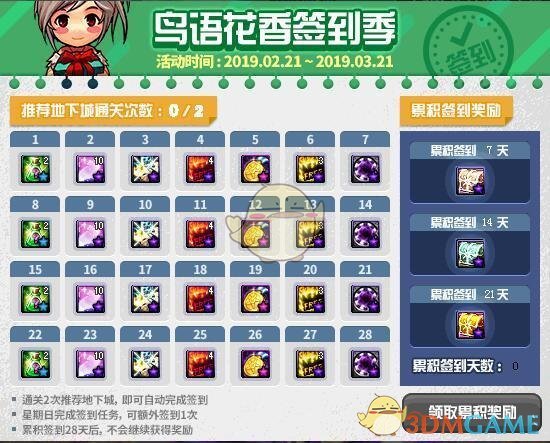 每日只需要通关2次推荐地下城即可完成签到,领取对应的奖励,累积签到21天还可以领取所有的高级奖励,其中包括常规药剂、王者契约、强袭模式门票、黎明裂缝门票、深渊门票、星空裂缝门、强化器、锻造器等,除此之外还可以获得魔岩石,更有90级史诗防具自选礼盒。
