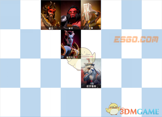 如图是己方存在恶魔情况下的阵型,由于恶魔本身较脆,又是前期重要的输出点,就需要保护其不会刺客切死。因此分出一个战士到后排代替恶魔成为被刺客攻击的目标,为恶魔争取释放技能时间。