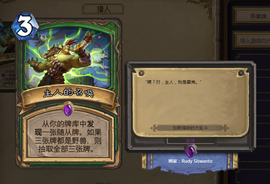 随着野兽猎的增多,当前版本的新卡“主人的召唤”也正式成为玩家最喜欢的卡牌之一。在野兽猎的卡组中这张卡牌可以稳定过3张牌补充自己的手牌,可以说有了这张牌我们不用担心前期的手牌数量,也正是这样该卡牌的胜率高达56%。