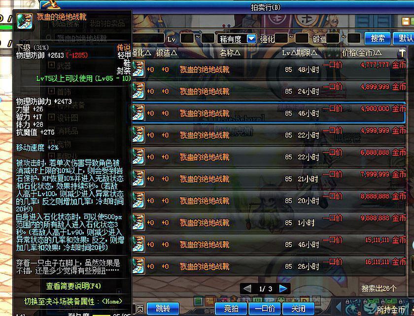 这是一件85级的传说轻甲鞋子,在鸟背副本没有出现之前价格基本在100万金币出头,随着鸟背副本的出现,加上黑商的炒作,现在的这个85级的传说鞋子,已经涨到了快500万金币。而这件鞋子几乎可以无视鸟背BOSS的所有机制,无论是走圈还是地火,只要换下这件装备,都能避免被秒杀的下场。可能有玩家会说85级的装备,在鸟背副本中是没有效果的。其实不然,这件装备本身触发的效果对角色还是有效,只不过对于敌人的石化效果无效而已。