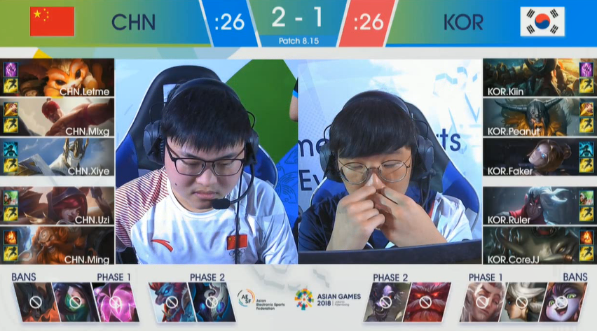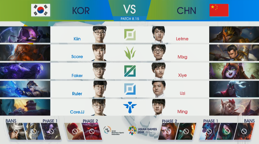 韩国选用:酒桶、、凯南,中国队选用:赵信、皇子。