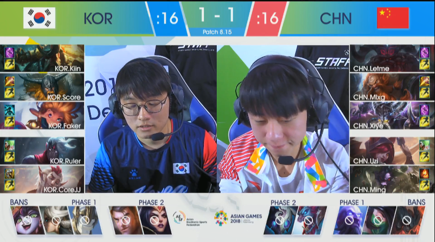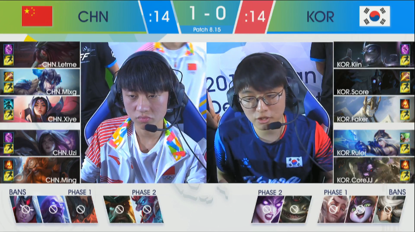 进行第一轮bp:韩国禁用青钢影、正义巨像、牛头,中国禁用:剑魔、阿卡丽、巨魔。