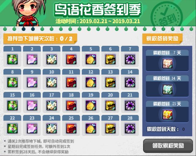 与我们之前的签到活动一样,这一期也是21天领取终极奖励,每天刷2次推荐图自动签到,星期天当天签到的话会额外获得1天的签到数目。因为2月份只有28天,所以活动时间也是28天,可以领取到全部单日奖励。那么我们一起看看这一期的签到奖励究竟如何。