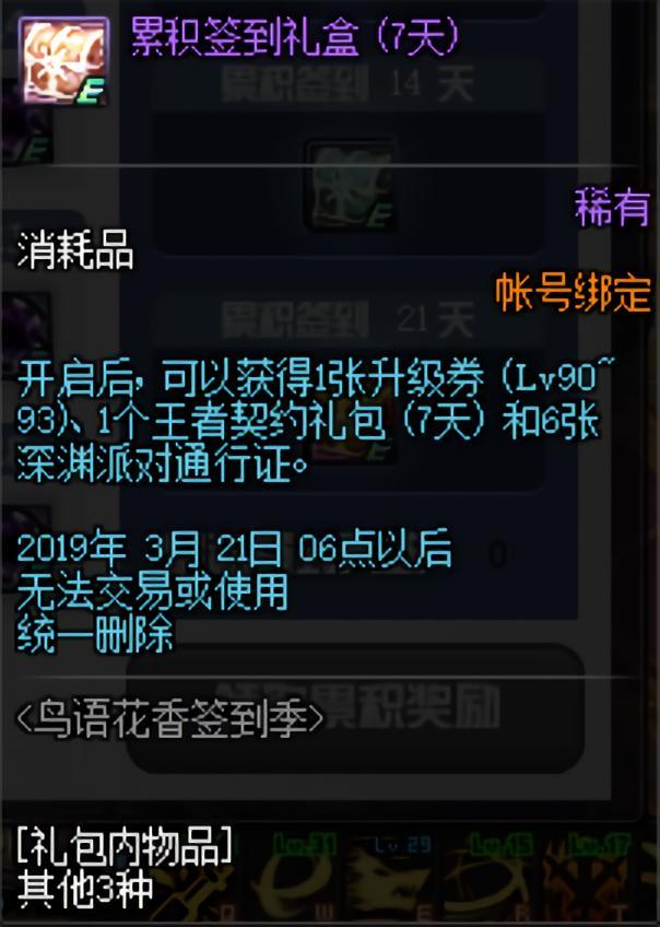 累计签到7天送1张90到93级可以用的升级券,7天的王者契约和6张深渊派对通行证,好吧,送3张星空裂缝通行证也行啊,普通深渊票多的是。