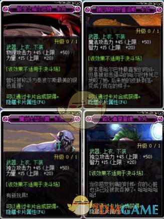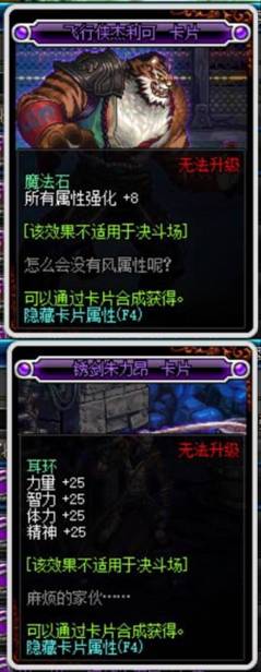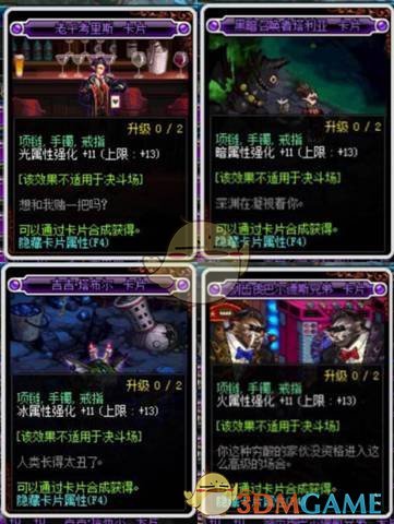 新版本也有属强紫卡,单属强卡未升级时11点属强,升满后13点属强;全面优于90版本的紫卡附魔,且13属强完全可以让这些卡片成为进军卢克raid或泰波尔斯的门槛附魔,而且价格相当便宜,火暗属强仅需40W左右,冰光属强稍微贵点也只需要80W左右。
