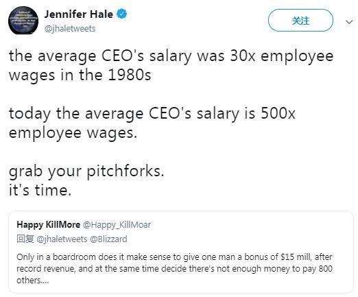 Jennifer Hale也在推特上回帖吐槽:上世纪80年代时CEO的平均工资是员工薪水的30倍,而如今CEO的平均工资则是员工的500倍。是时候拿起你们的干草叉了。