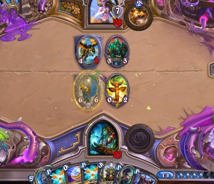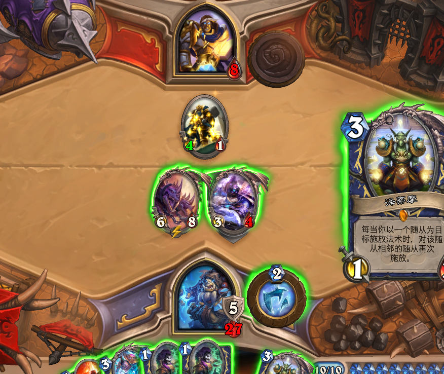 8费66圣盾嘲讽,能当墙使用可以有效阻挡对方的攻击。当他阵亡之后还能送你一把武器,简直可以说是传说随从中的战斗机。但是,假如你以8费的代价将他召唤出来,一旦被对反解掉,那未免有点让人心疼。所以,最好的结果自然是通过进化将他进化出来,这样自然能一了百了。