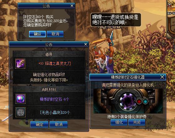 而90版本的新增NPC红尾乔纳森也有强化系统,只是消耗的不是金币而是精炼的时空石。品质越高的装备,强化越高的等级,在乔纳森哪里的收费就越便宜。比如强化11的85级传说武器凯丽收费是59.8w和120个无色,而红尾乔纳森则是6个精炼模式和120个无色,6个精炼魔石直接购买才50.2w。虽然每天时空石的价格都不同,但绝对比凯丽的便宜,低品质,低阶段的强化不建议去乔纳森那里强化。