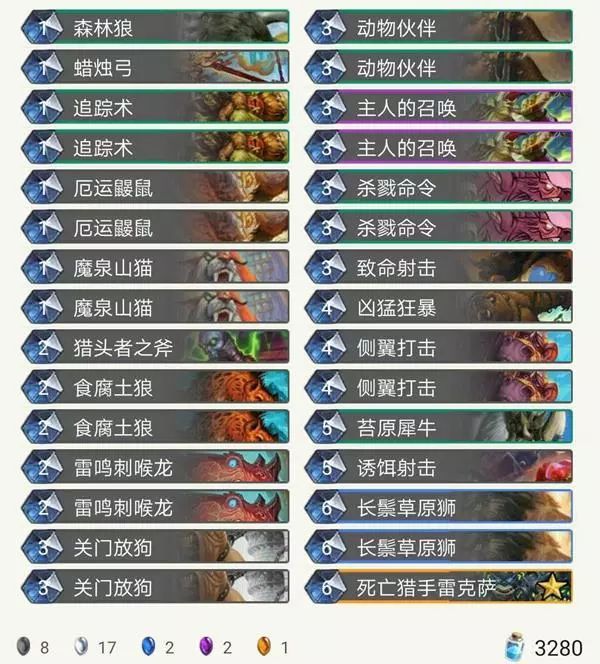 野兽猎的强势不必说大家都知道,摇摆哥目前用这套卡组打到了国服第四,我就静等登顶了,印记被砍之后,许多猎人都不带了,确实用起来不太舒服。森林狼优势是一张好牌,劣势就会显得异常卡手,只带一张是一个不错的选择。野兽猎是目前上分的绝佳之选,造价也非常便宜。
