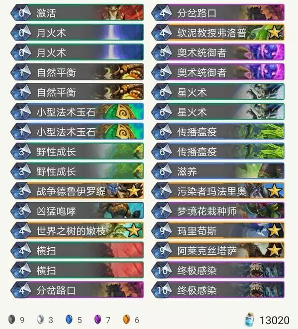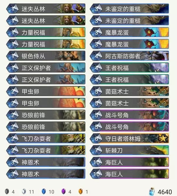天梯中比较少见的卡组,这套别出心裁加了两张星火术来过牌兼打伤害,也算弥补了一些时候蓝龙德伤害不足的情形,可以轻松解掉犀牛等高威胁生物。蓝龙德打现在的牧师还是完全不虚的,有一些优势,只是打战士很难打。