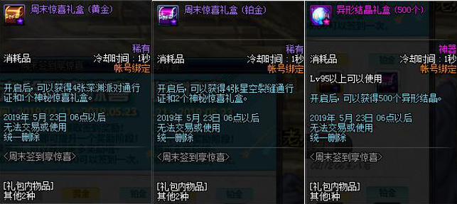 顾名思义,这个活动只能在周末进行,在持续四周的活动中,玩家一共可以获取到8张深渊派对通行证和4个星空裂缝通行证,还有950个异形结晶,虽说只用玩家登录游戏就可以领取,但是周期比较漫长,需要一个月才能领完奖励。