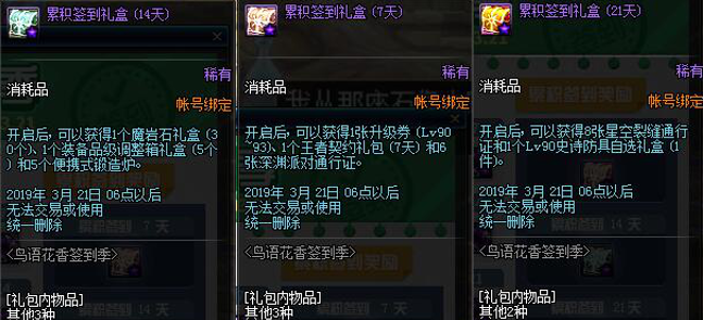 这次签到活动堪称史上最良心同类签到,不过放在95版本,相对来说就没那么诱人了。活动形式跟以往一样,持续3个7天便可领取累积奖励,每日签到奖励分为属性药水、雷米、契约、强袭门票、黑夜穿行证、黎明裂缝门票和强化器。累积奖励有锻造炉、深渊票和升级卷、史诗、魔岩石等重要奖励,其中升级卷在90到93级都可以使用。